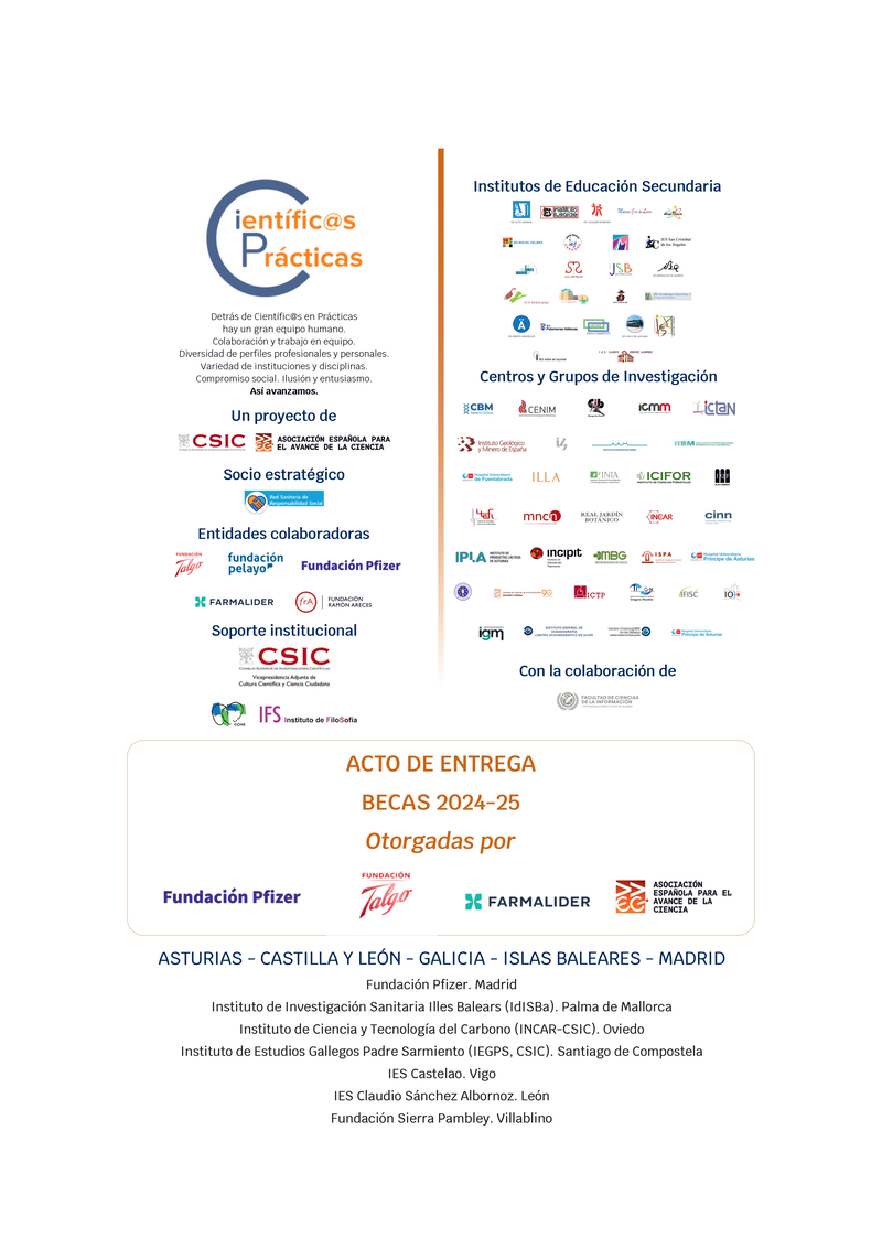 El próximo viernes 3 de octubre, por la tarde, celebraremos el acto de entrega de becas a los mejores trabajos presentados por el alumnado de Científic@s en prácticas, resumiendo las actividades realizadas y lo aprendido durante sus estancias.